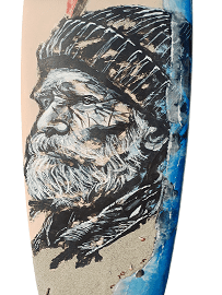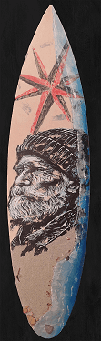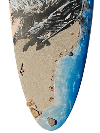 Acrylic, resin, wood, shells, sand, seaweed, shells on upcycled surfboard