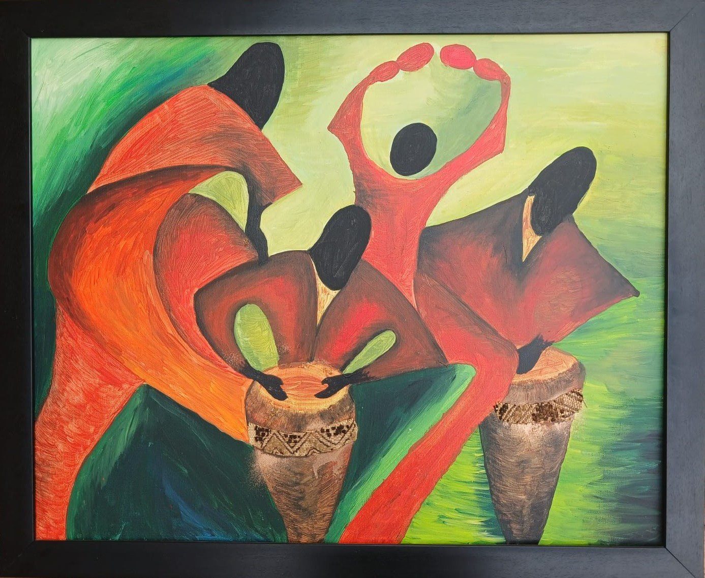 Acrylic on cloth stretched canvas, with pieces of mud cloth stuck on, and framed
